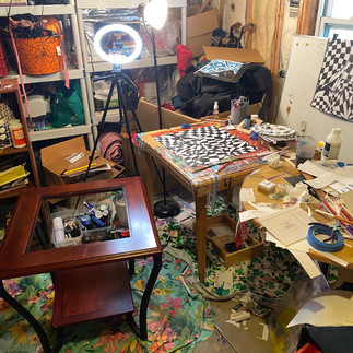 I got started on the back piece first, because I knew it would be the most tedious. I had a great picture in my head: splatter the table and incorporate my favorite pattern: checkerboard. However, I didn't want to paint just a boring checkerboard. I used Puppet Warp on Photoshop to create the pattern. Below, you can see the process from development to execution of the checkerboard: